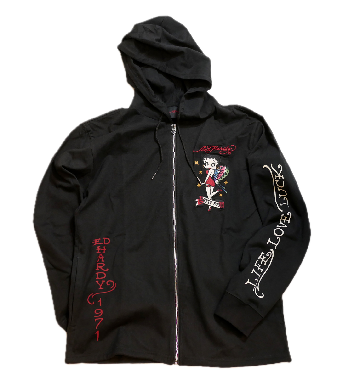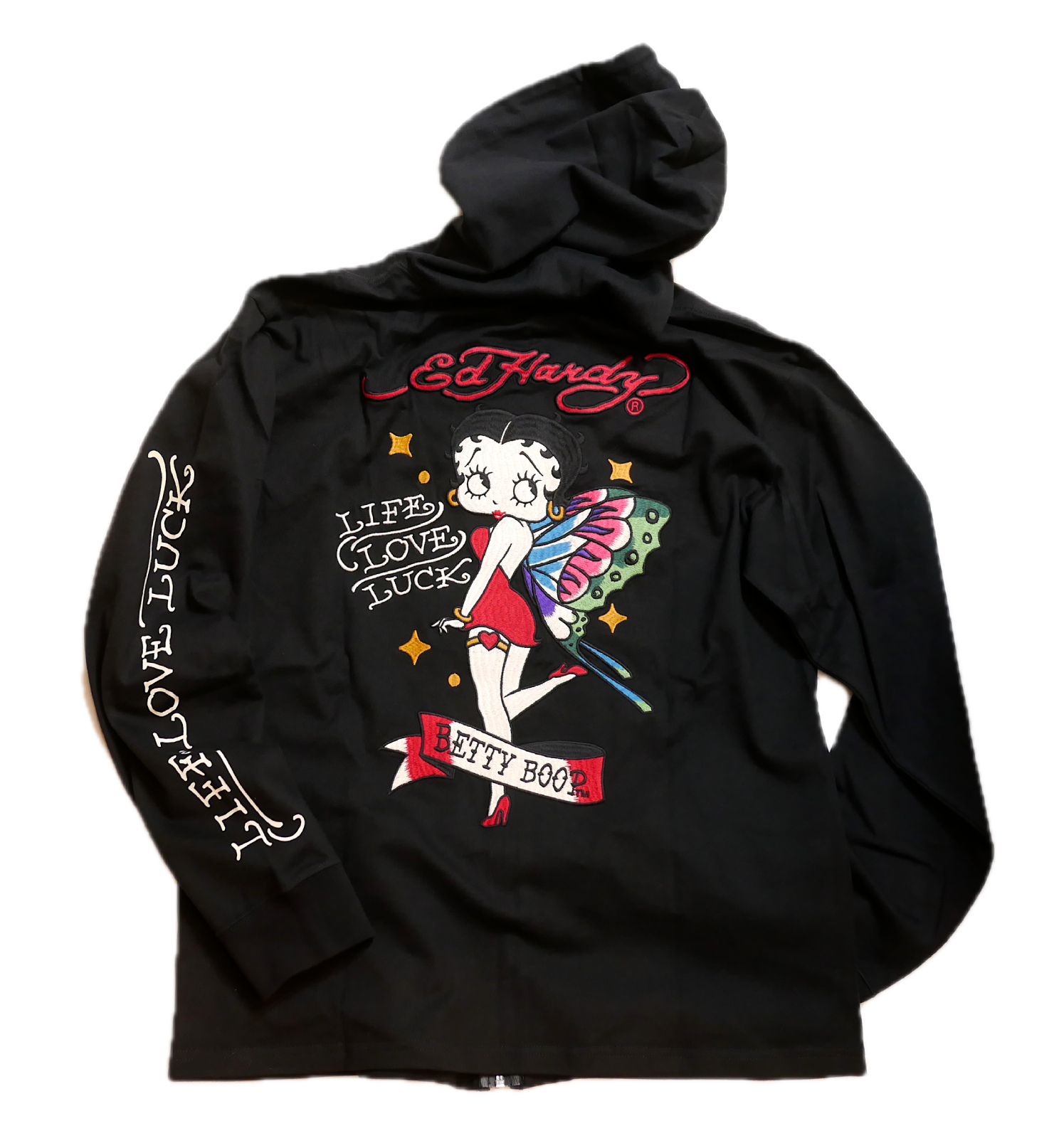 - > Bettyboop / Ed Hardy コラボ バタフライベティー 刺繍 Tパーカー BED-2509 ブラック