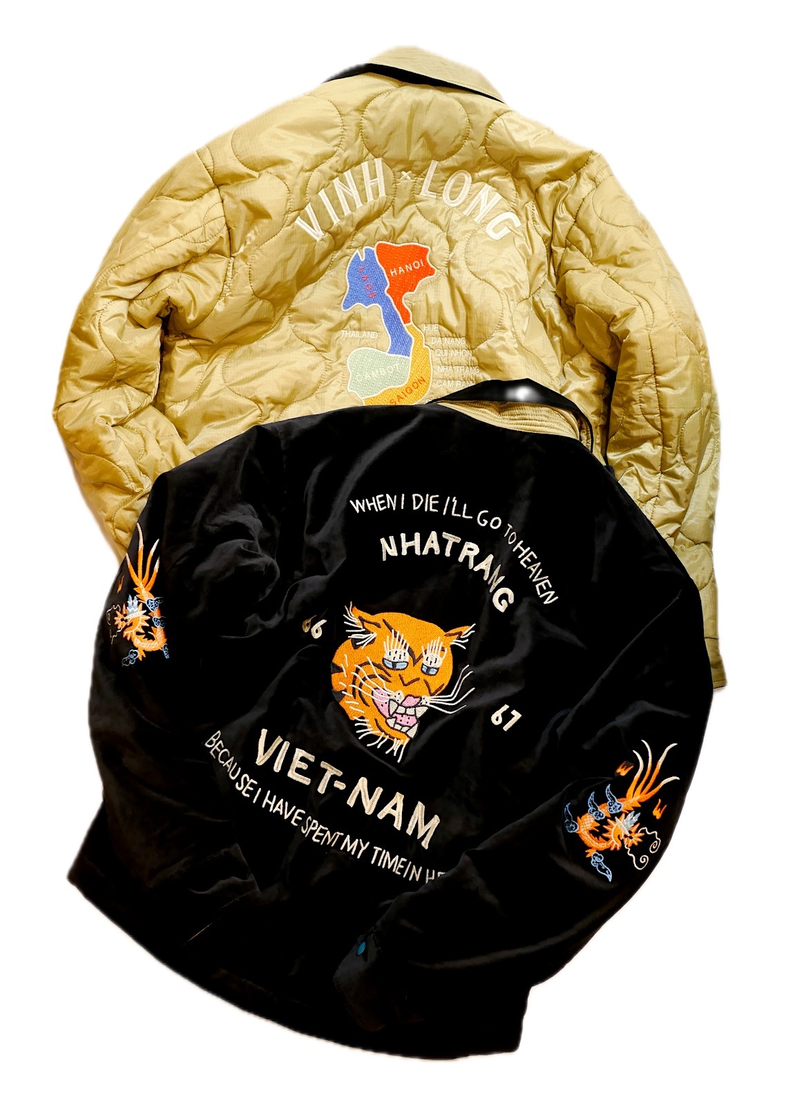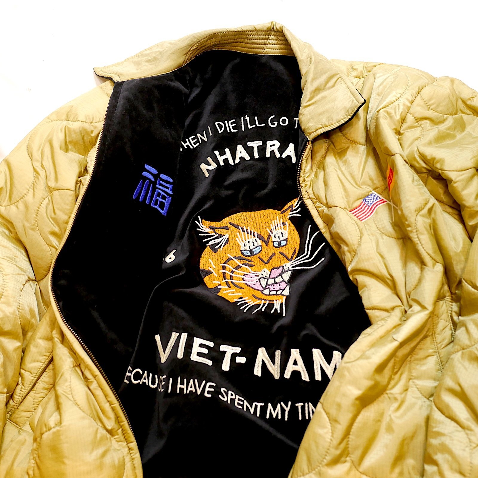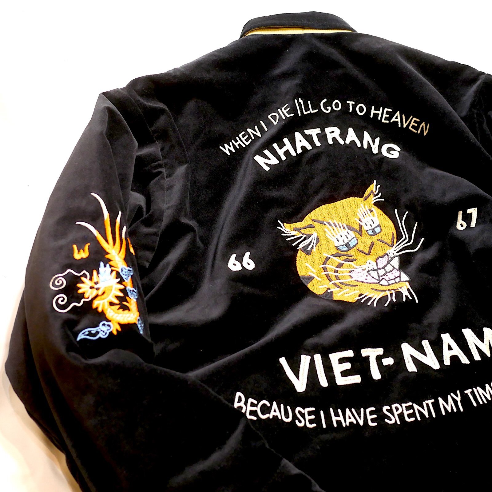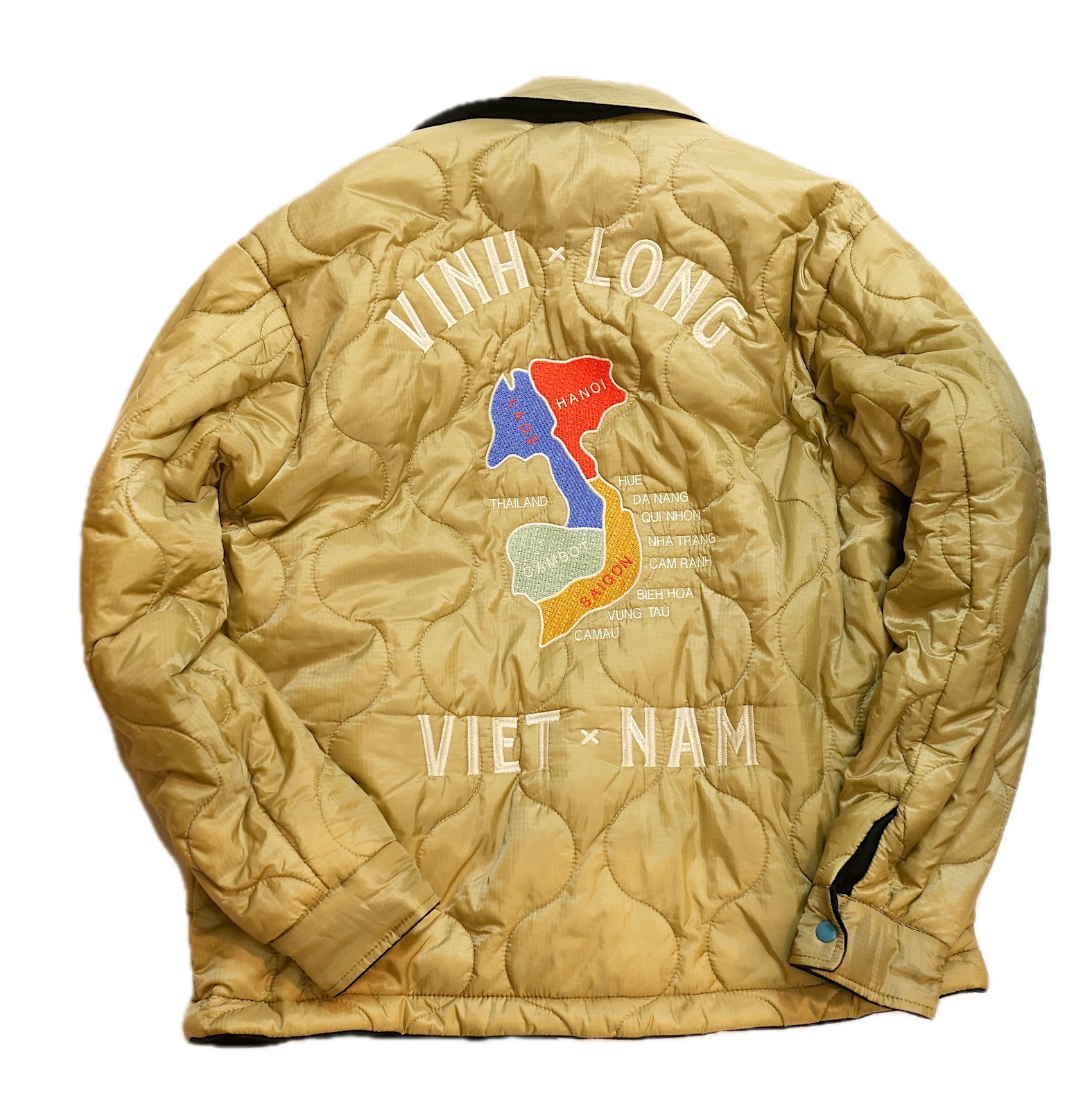 ヴィンテージベトジャンの柄をイメージし、全体に大きくインパクトのある柄を手振り風刺繍で贅沢に両面に施してます。