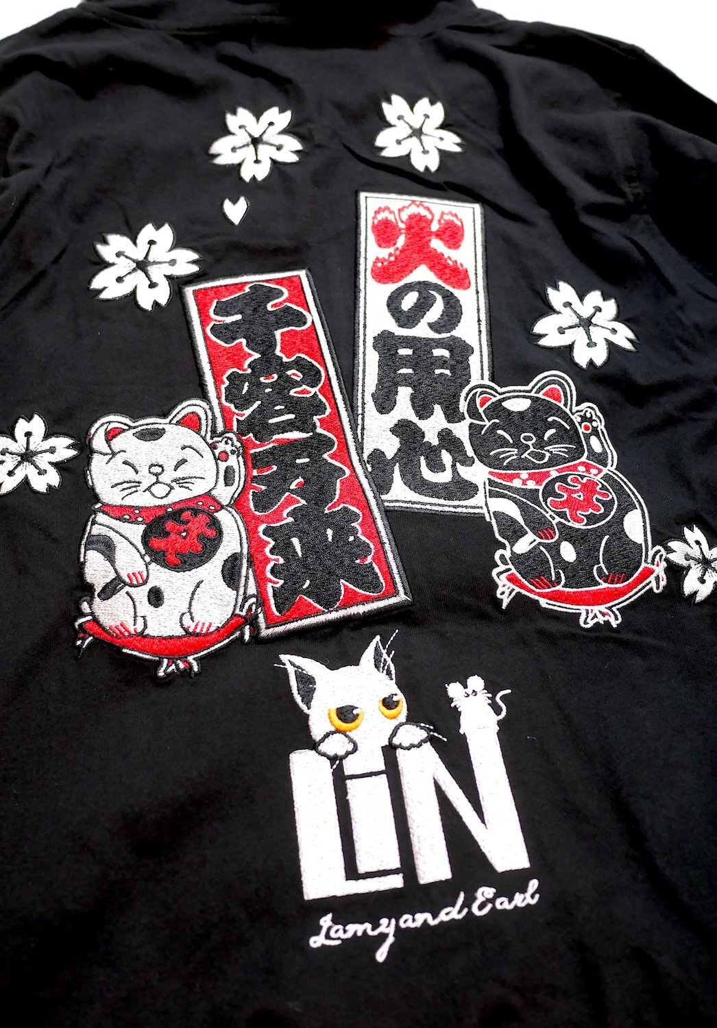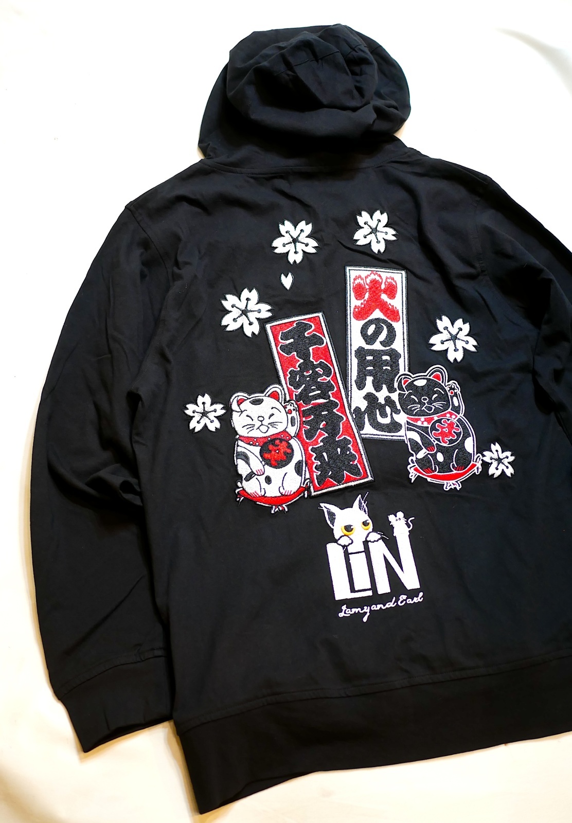 LIN (リン) Lamy and Earl [ 招き猫 ] 薄地 総刺繍パーカー AL-75807 ブラック